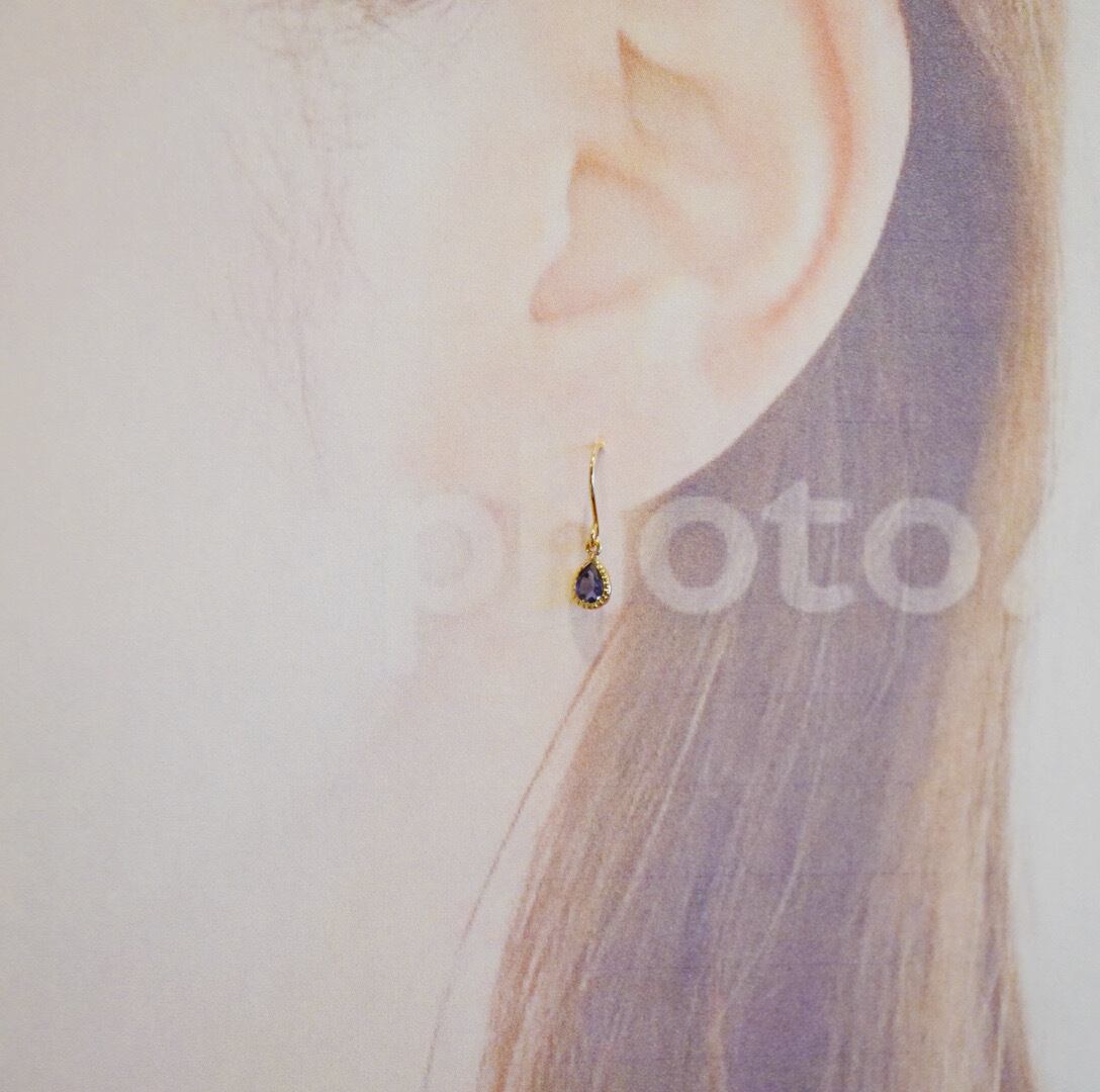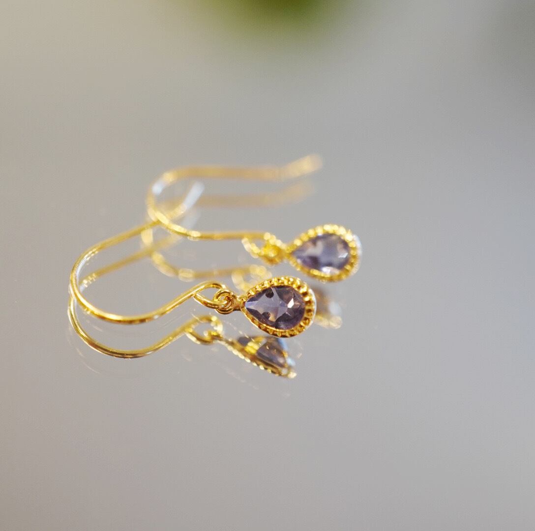 山梨の工房の職人が青紫の雫型の石を18kの地金で包み丁寧にミルグレインを施し、さり気なくも存在感のある美しいピアスに仕立てました