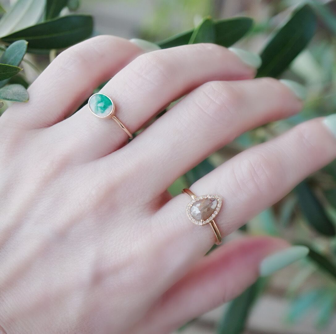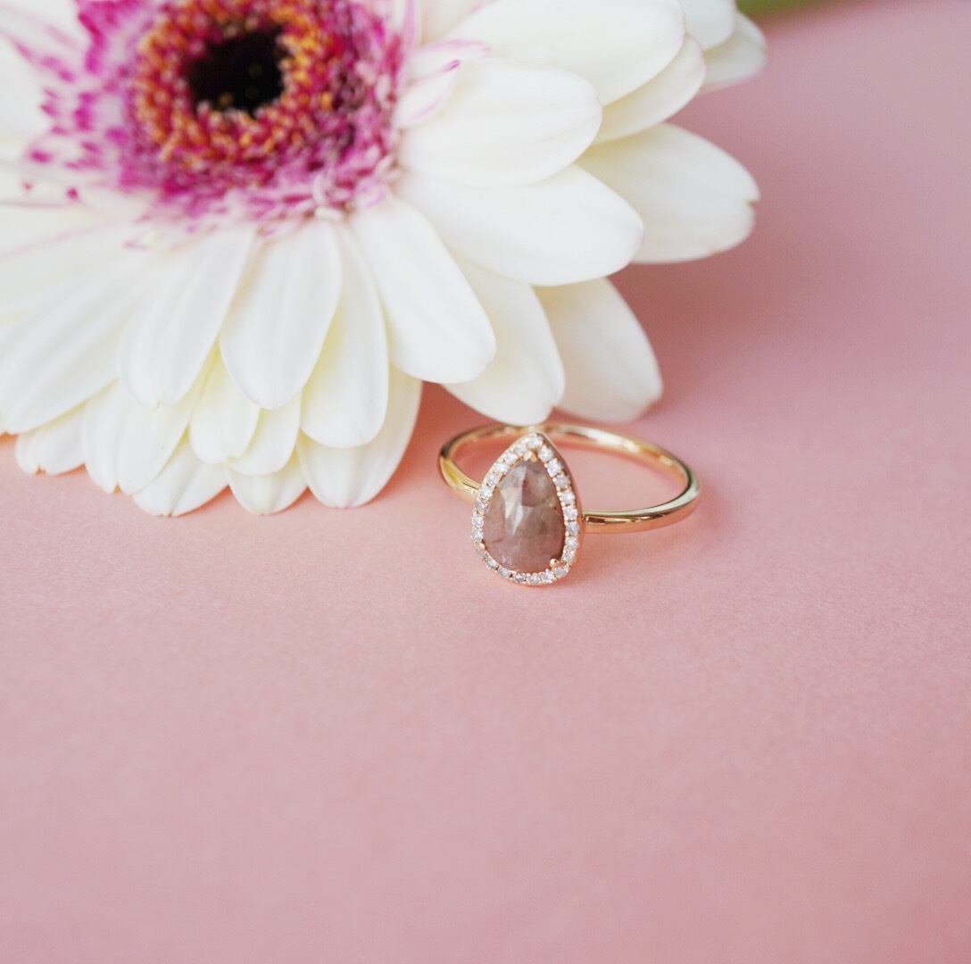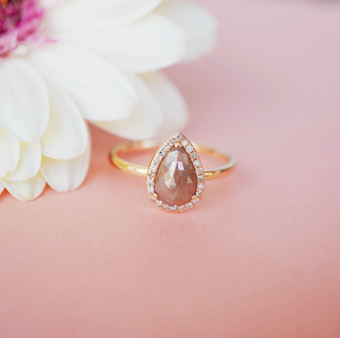 度重なる奇跡により、長い旅を経てようやく地表に現れた自然の姿のダイヤモンドを、その大地の色の美しさをそのまま活かして、宝石の都市インド、ジャイプールの職人が18kの地金で美しいペアシェイプ型のダイヤモンド取り巻きリングに仕立てました