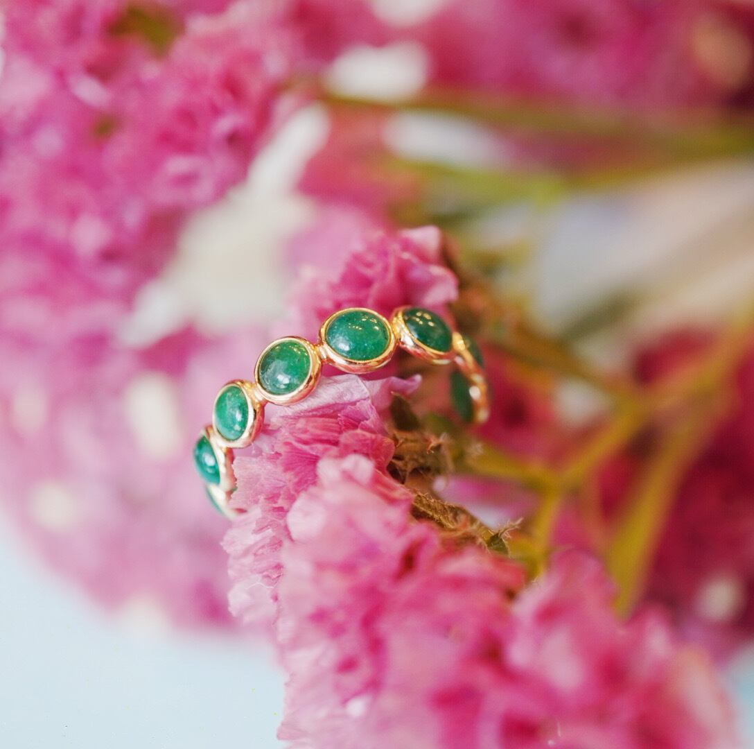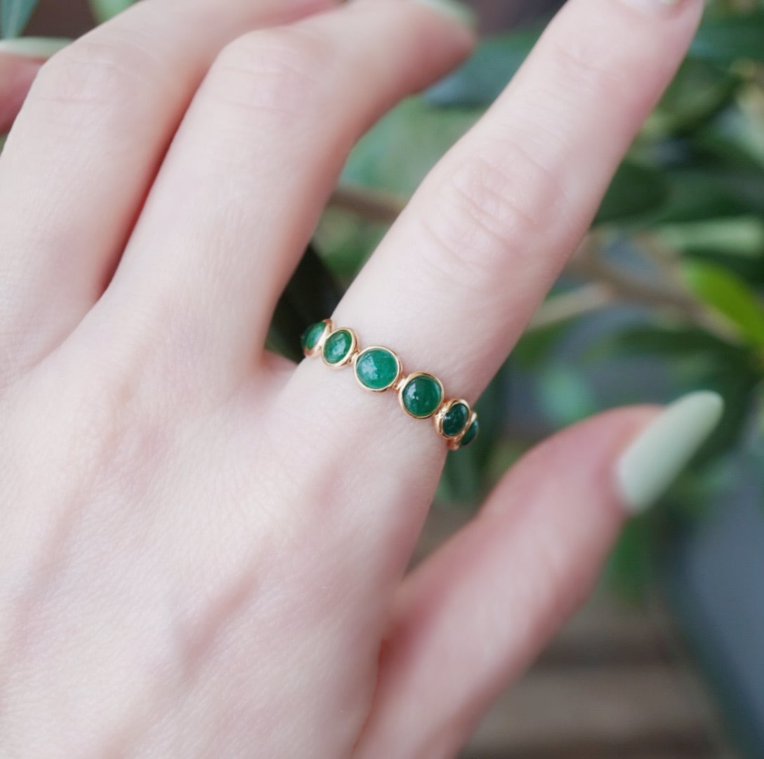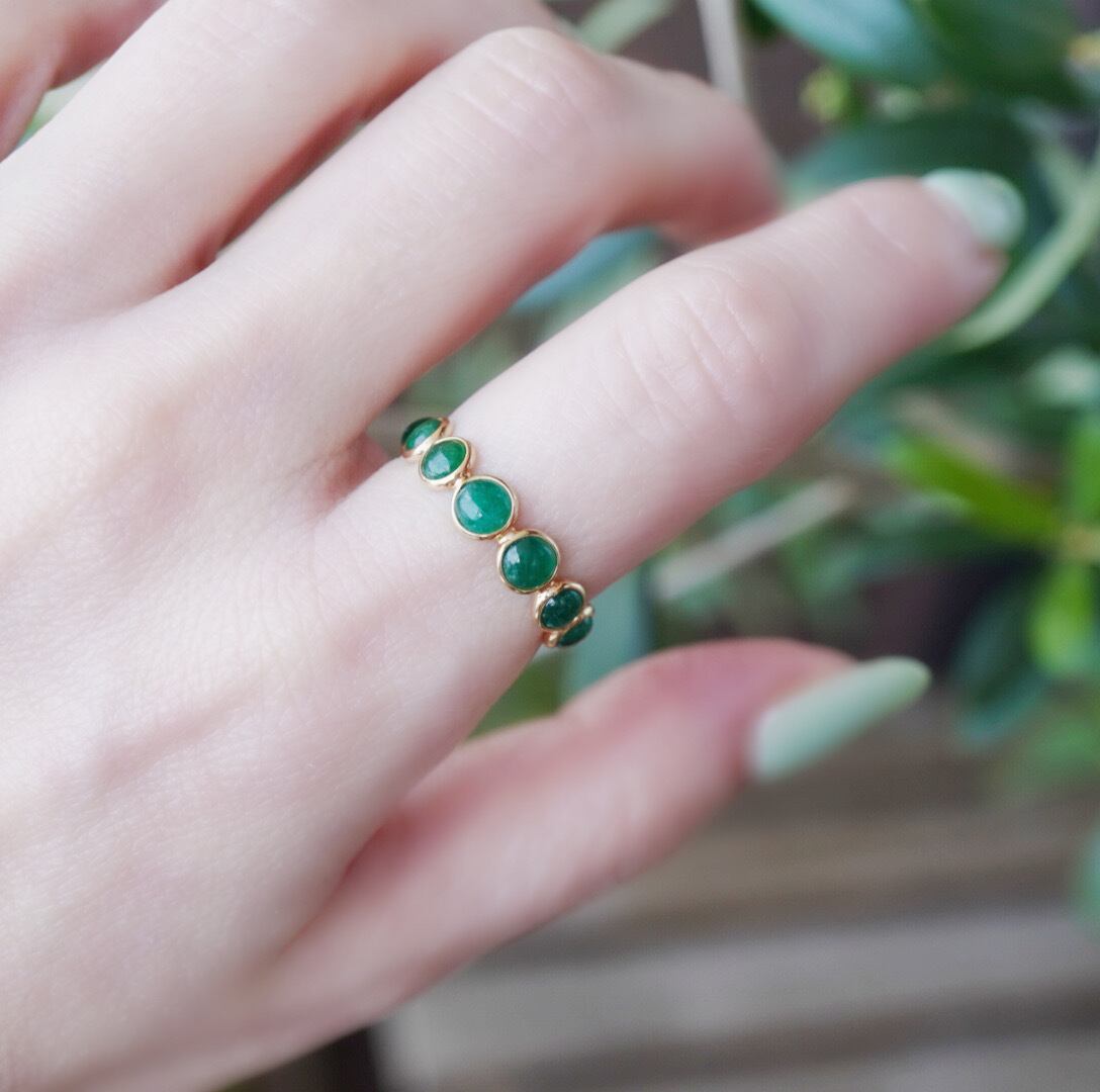濃い艶のあるグリーンが際立つエメラルドを宝石の都市インド、ジャイプールの職人が18kの地金で美しいエタニティリングに仕立てました