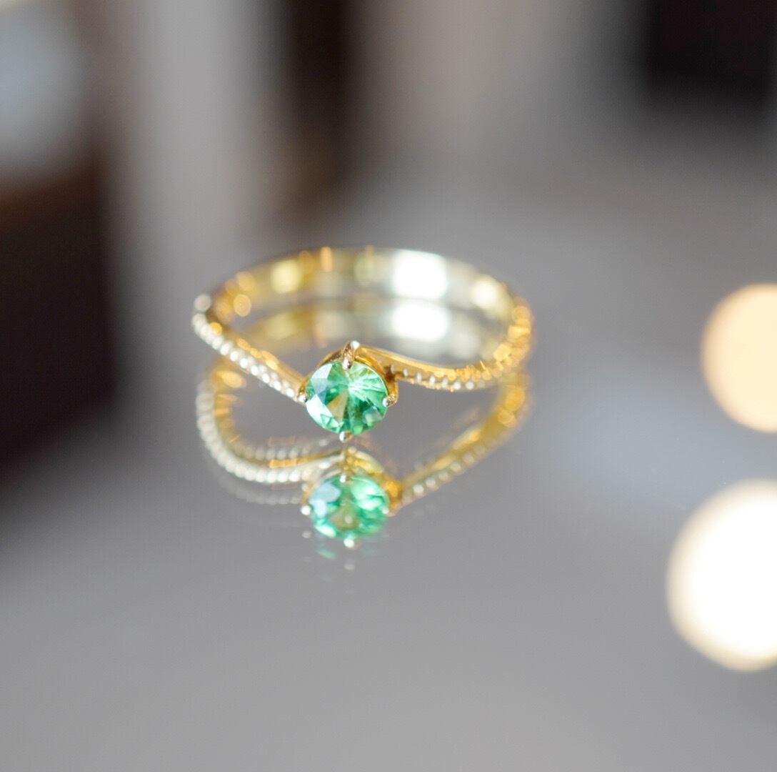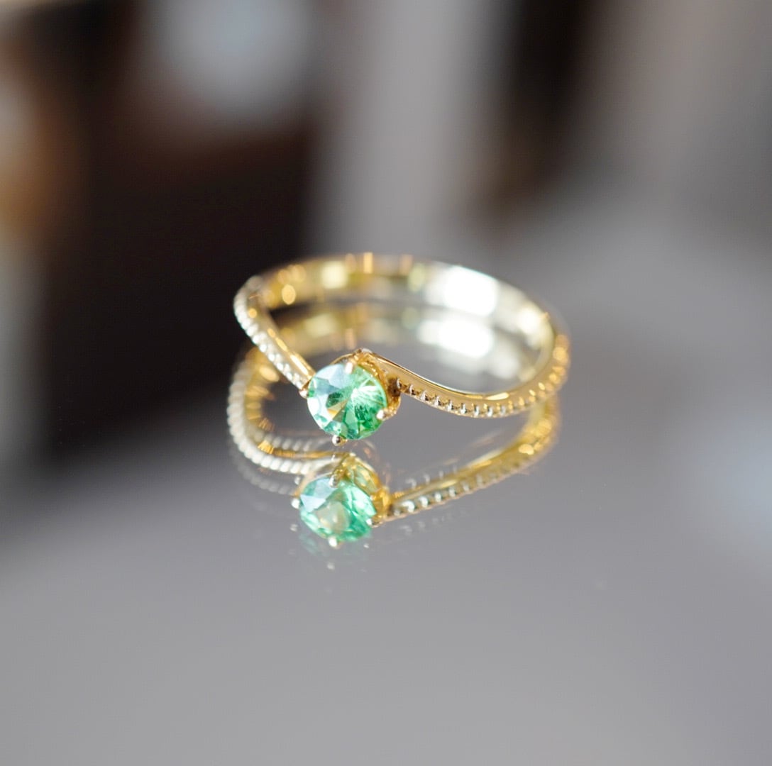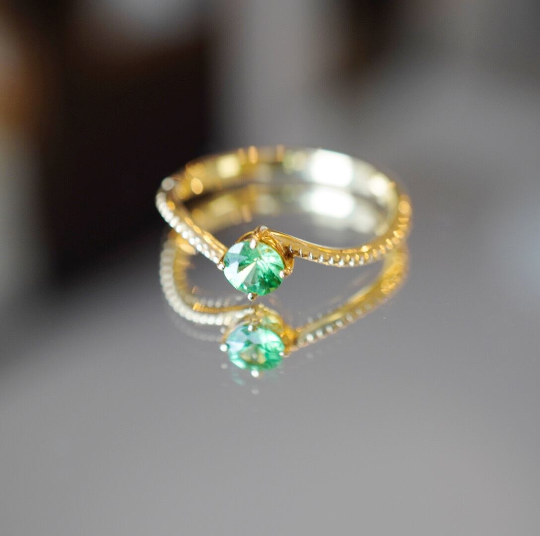 宝石の都市インド、ジャイプールの職人が鮮やかなグリーンの色味を活かして18kの地金にミルグレインを施し、指が美しく見えるデザインリングに仕立てました
