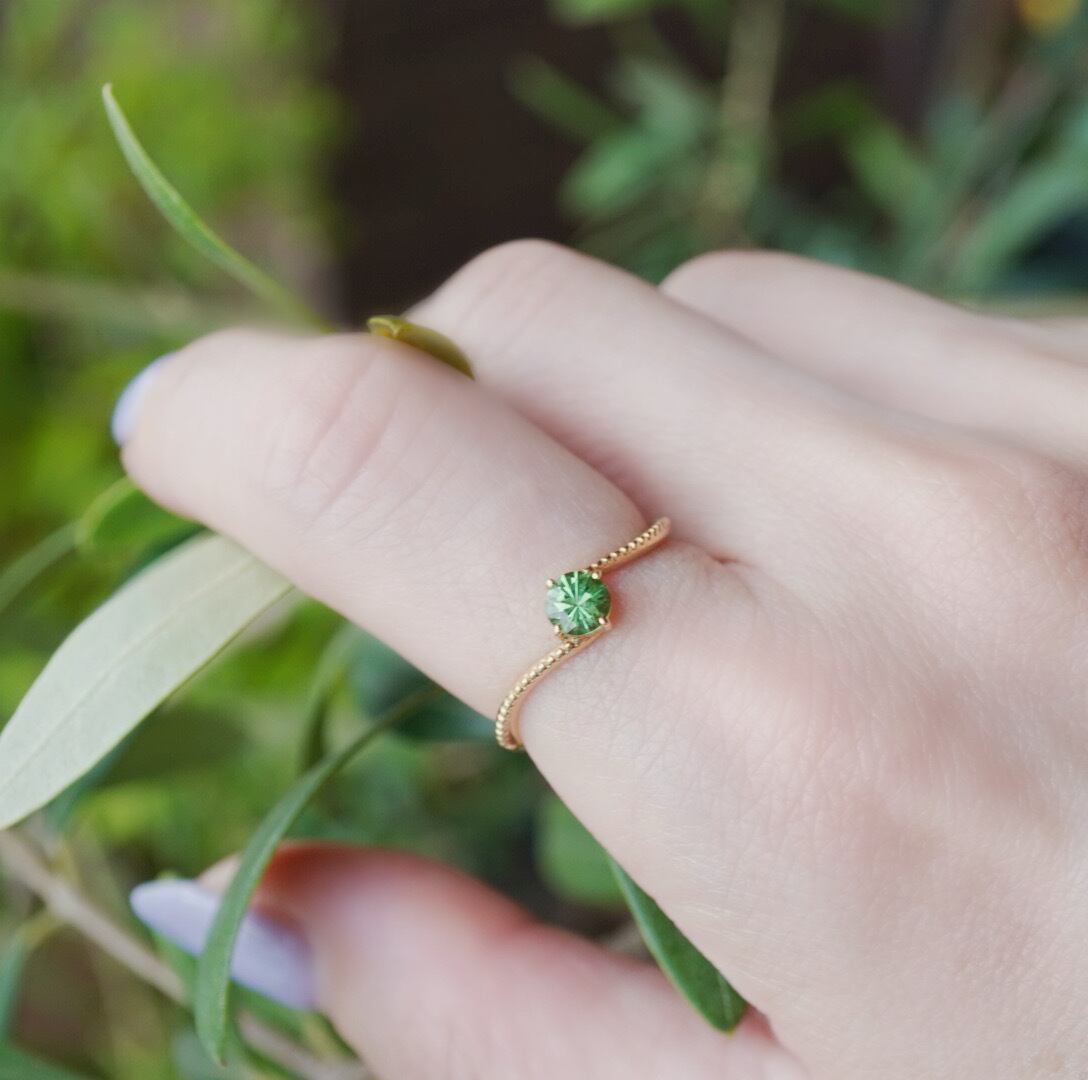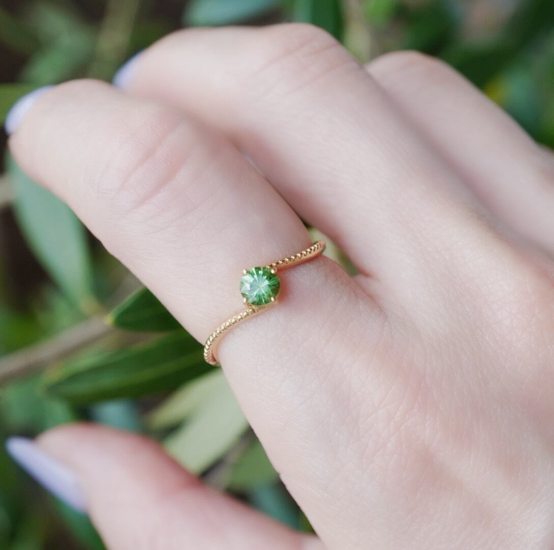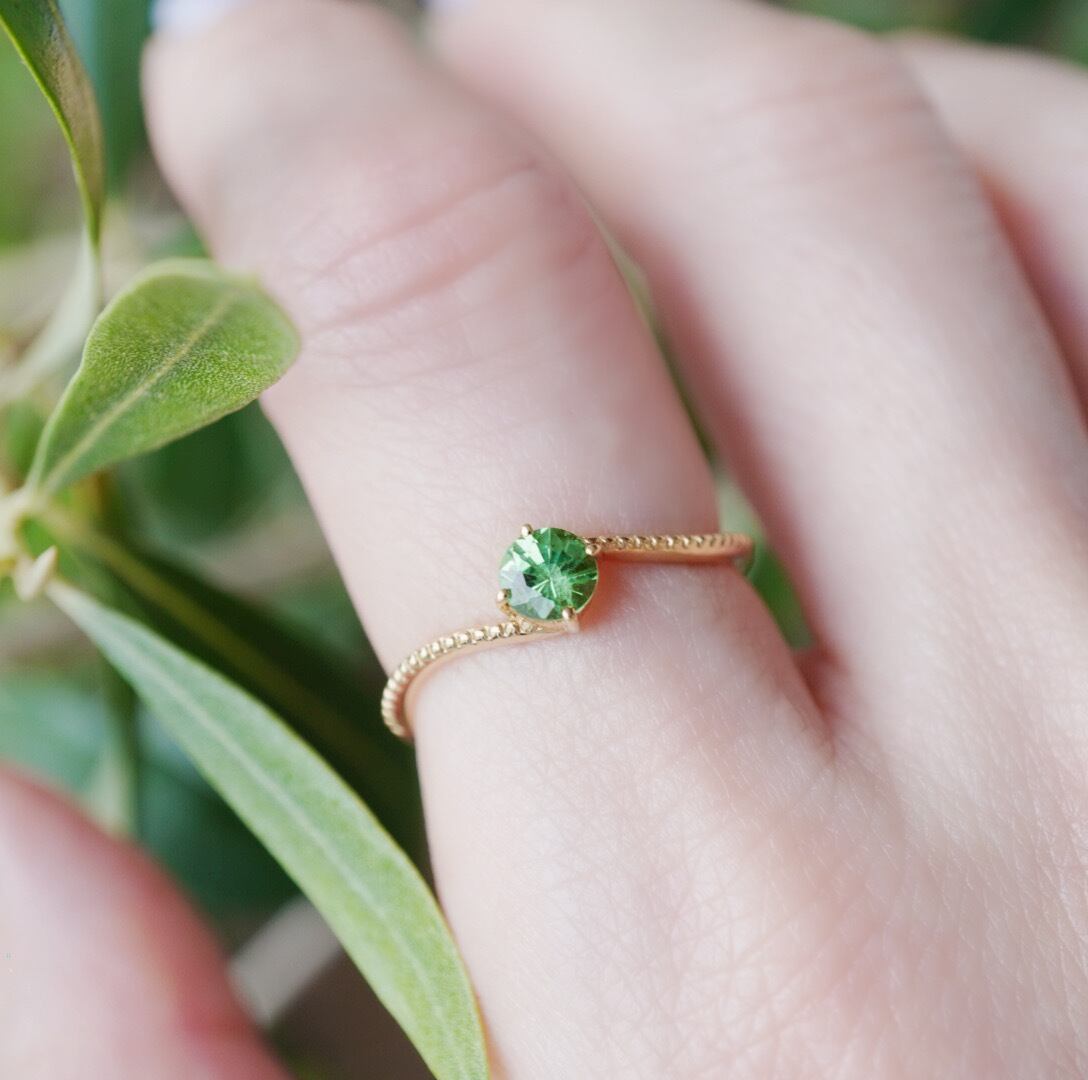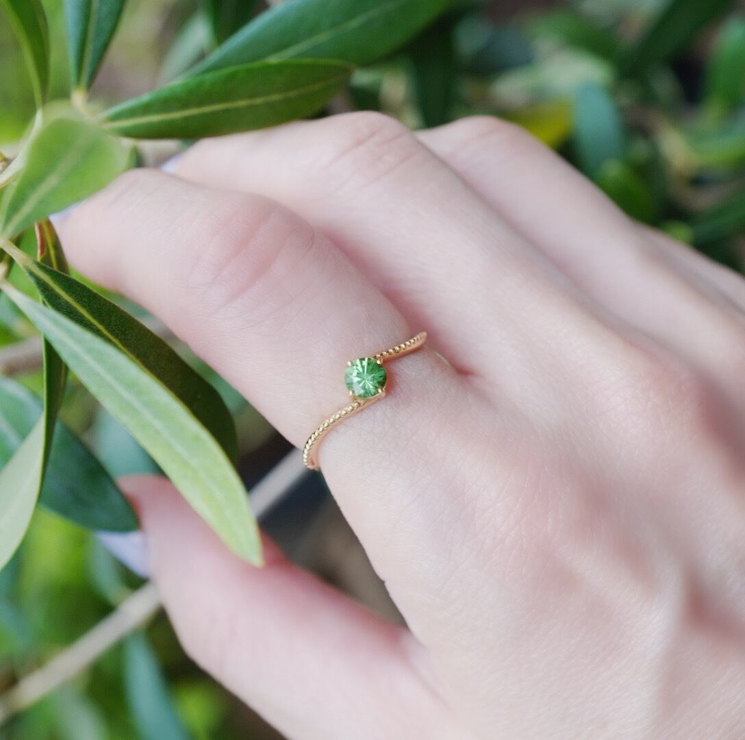 宝石の都市インド、ジャイプールの職人が鮮やかなグリーンの色味を活かして18kの地金にミルグレインを施し、指が美しく見えるデザインリングに仕立てました
