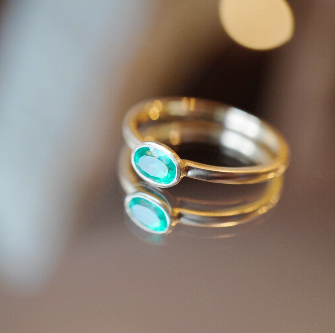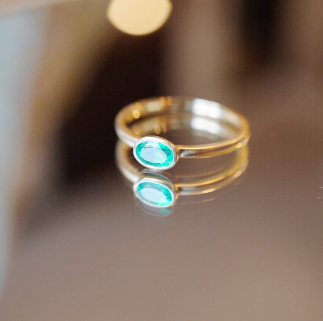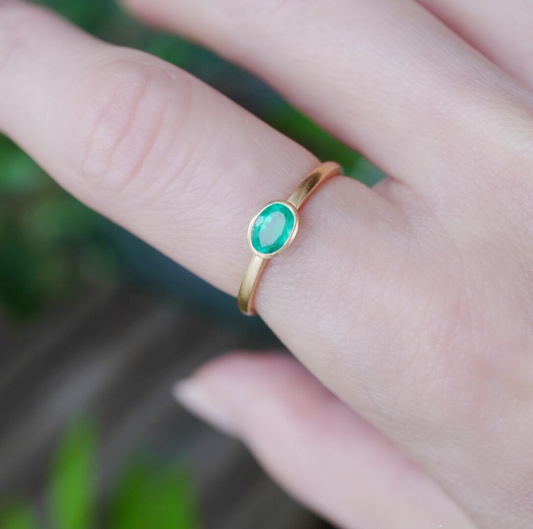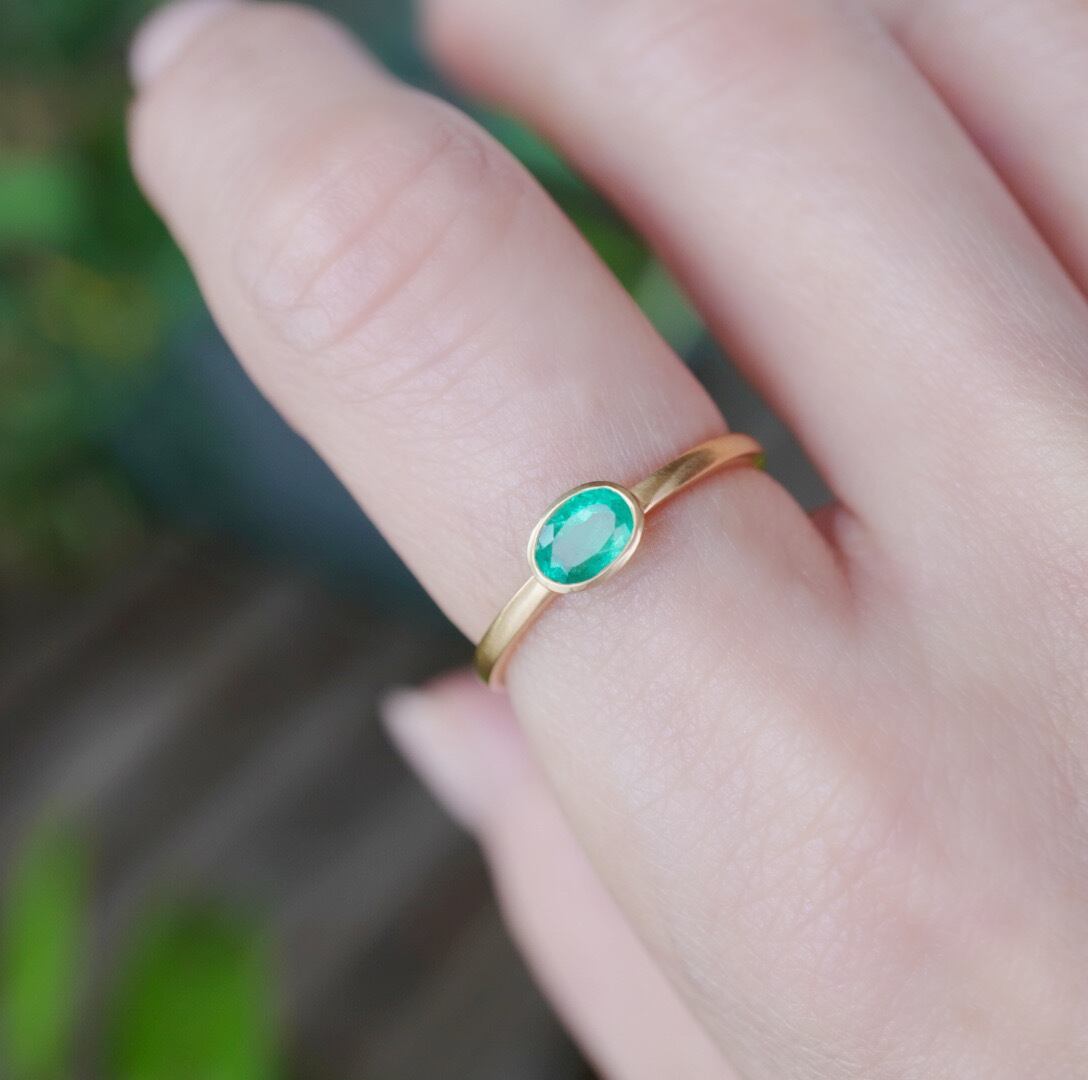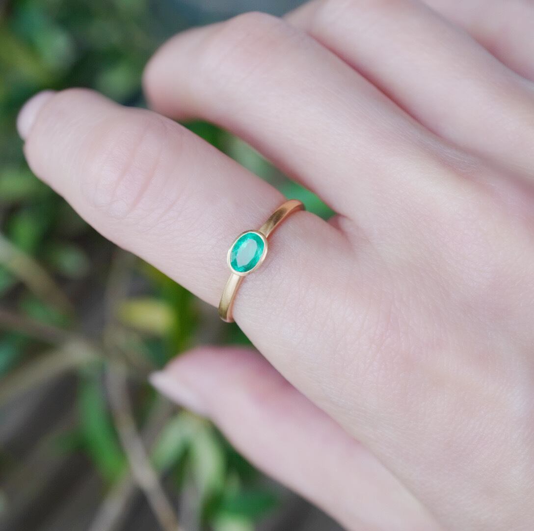 透明感の強い鮮やかなグリーンが際立つエメラルドを宝石の都市インド、ジャイプールの職人が18kの艶消しの地金で美しいオーバル型のリングに仕立てました