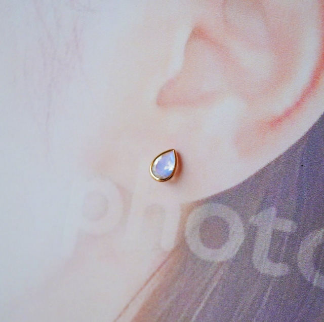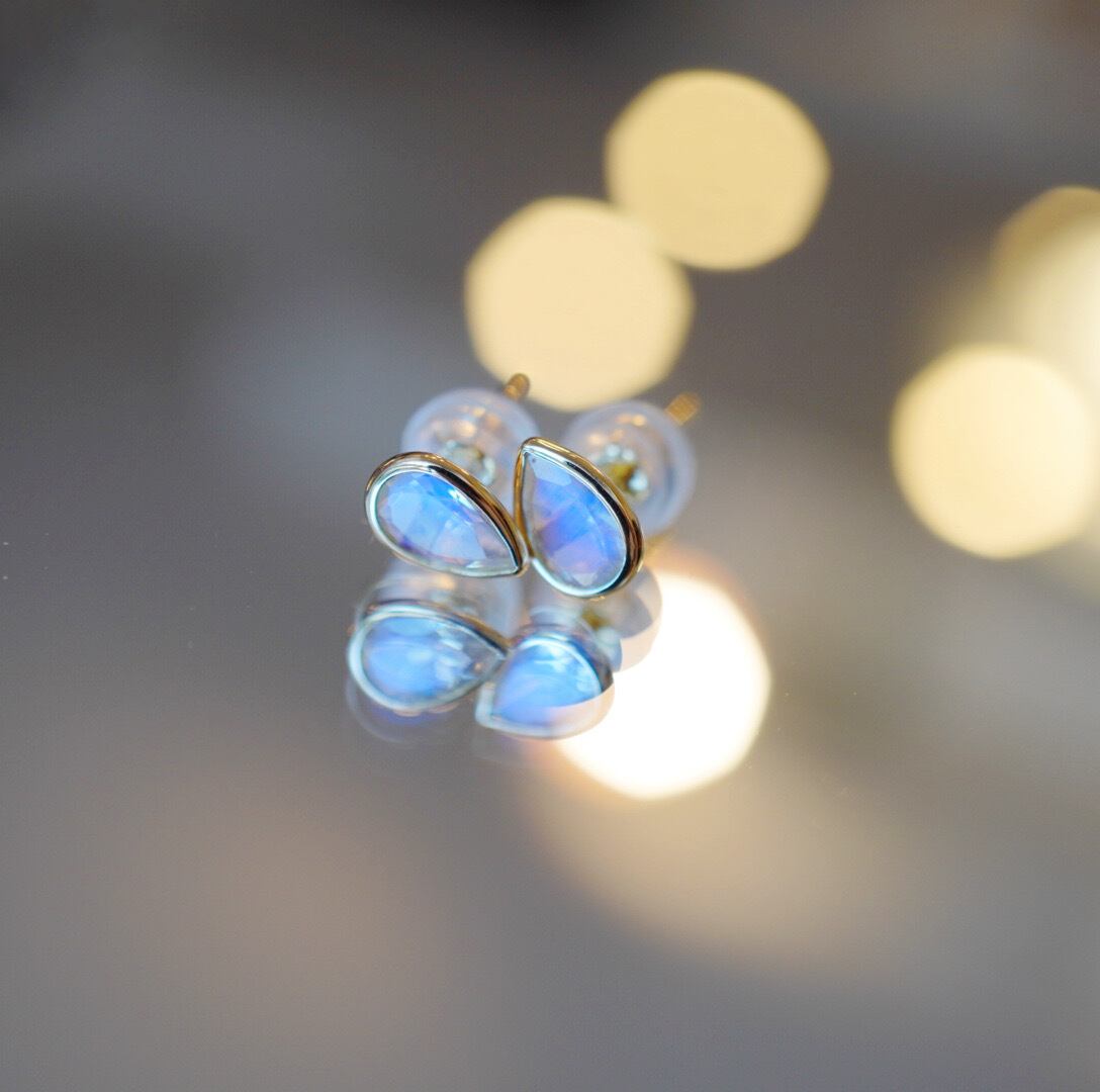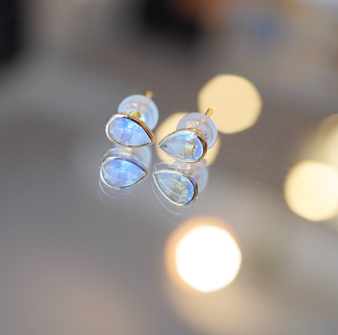 神秘的な月の光に包まれた石をその色味を活かして、宝石の都市インド、ジャイプールの職人が、18kの地金で美しい雫型のスタッドピアスに仕立てました