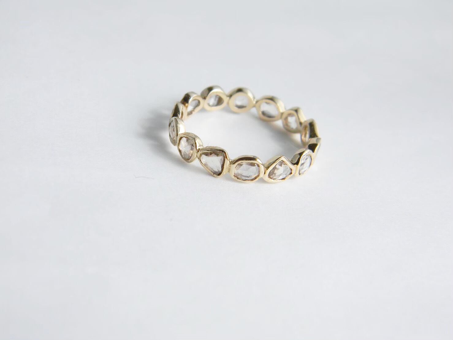 度重なる奇跡により、長い旅を経てようやく地表に現れたダイヤモンドを贅沢に使って、宝石の都市インド、ジャイプールの職人が一石一石にローズカットを施し、石そのもののフォルムを活かした繊細で美しいエタニティリングを作り上げました。