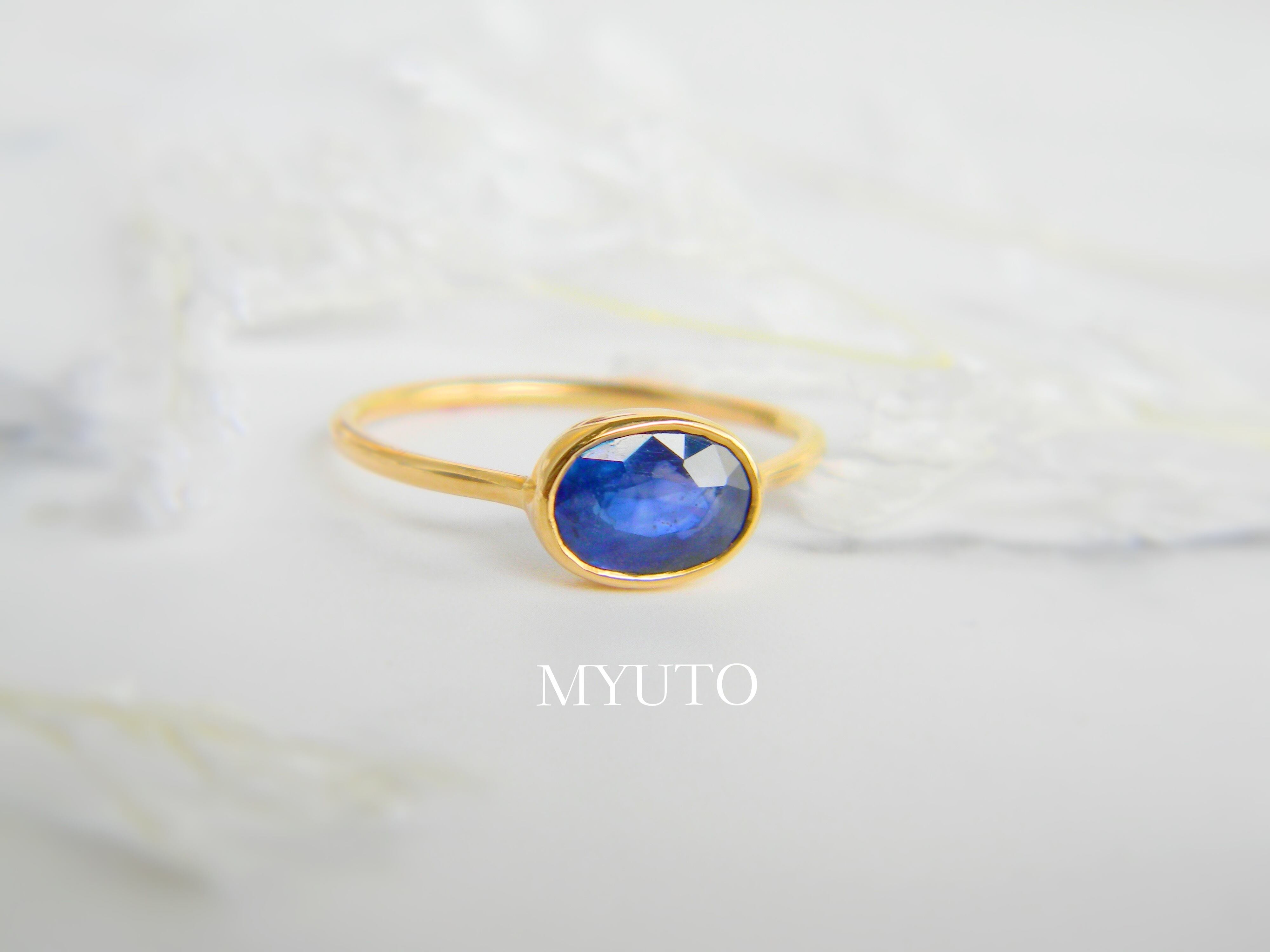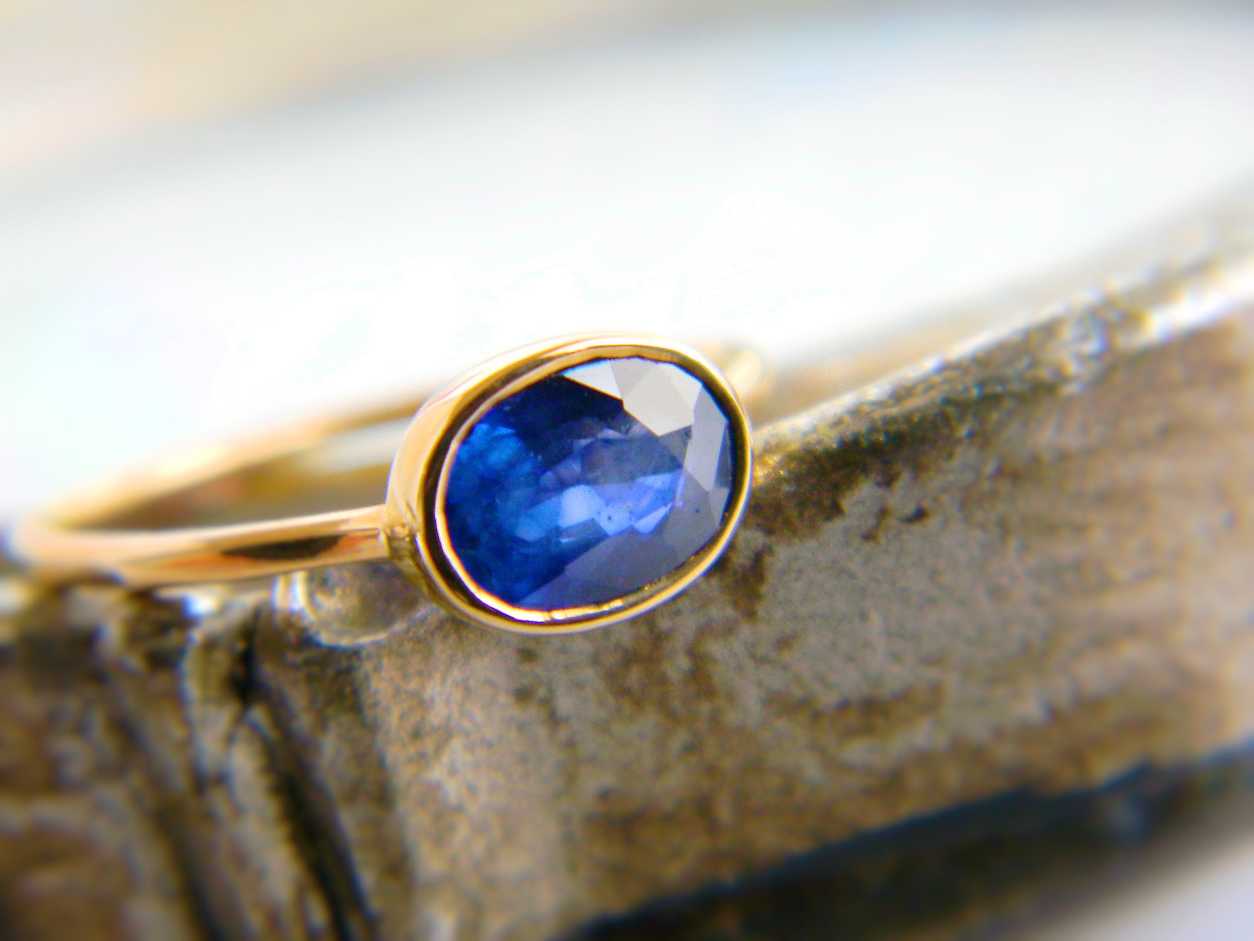 神秘的な美しさを放つディープブルーのサファイアを宝石の都市インド、ジャイプールの職人がその表情を活かしたシンプルな覆輪留めのリングに仕上げました。