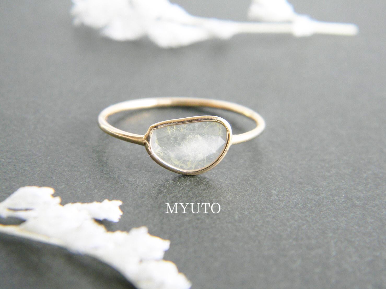 度重なる奇跡により、長い旅を経てようやく地表に現れた自然の姿のダイヤモンドを、宝石の都市インド、ジャイプールの職人がその技術をもって美しいスライスカットを施し10kの地金で唯一無二のリングに仕上げました。