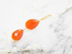 石英の結晶であるカルセドニー、その中でも赤やオレンジのものをカーネリアンと呼びます。宝石の都市インド、ジャイプールの職人が石の表情が活きるよう細かいカットを施し、色の美しさが映えるピアスを作り上げました。