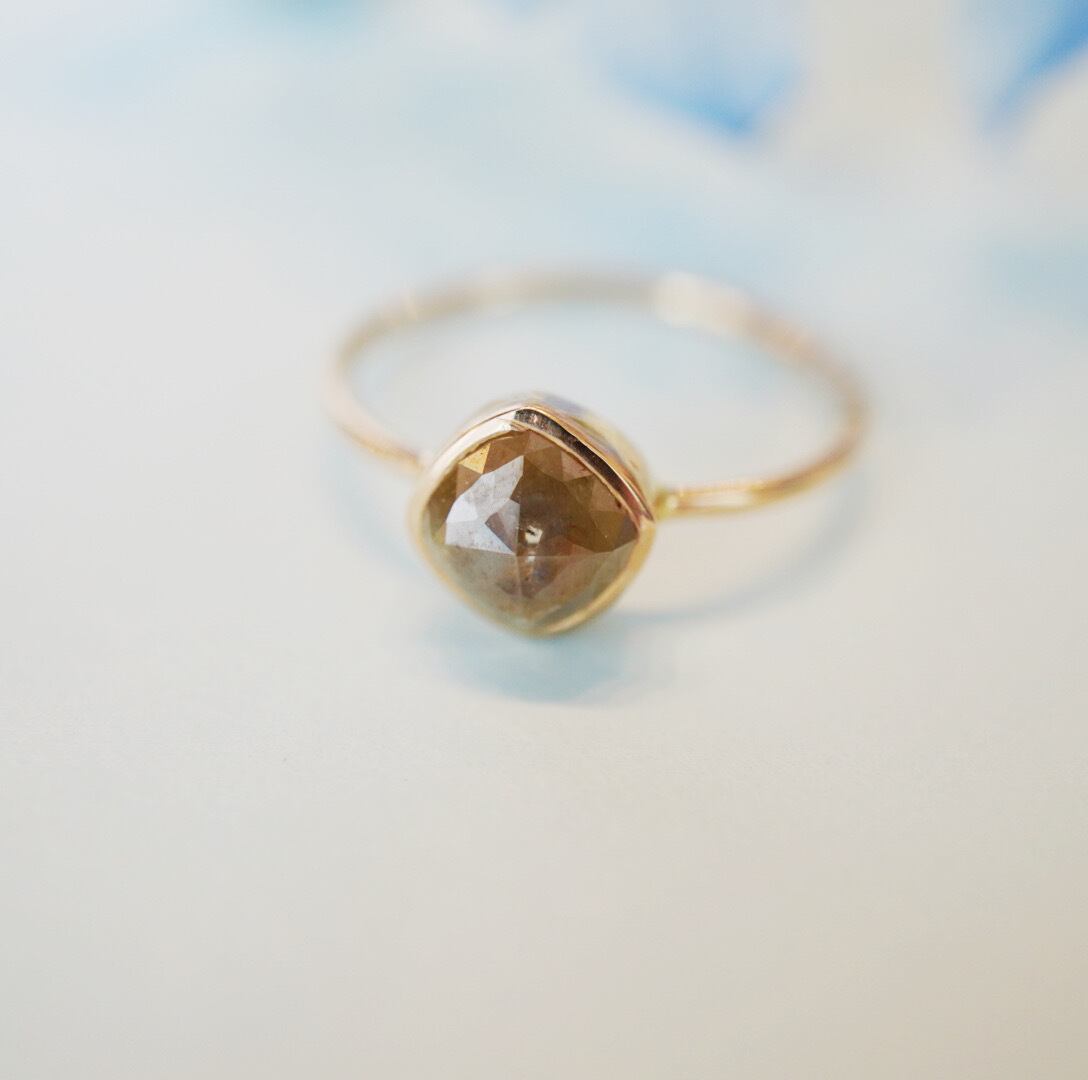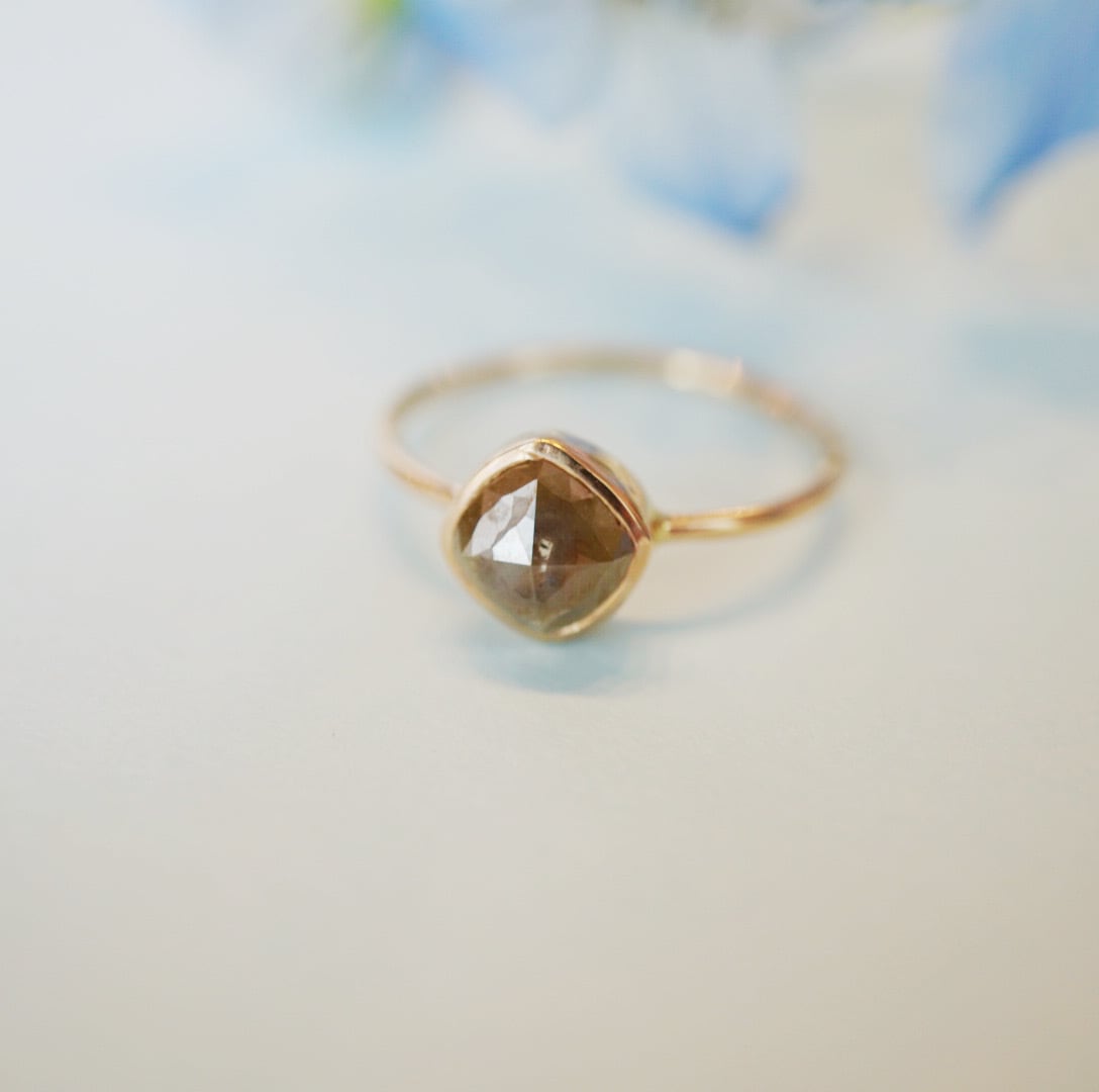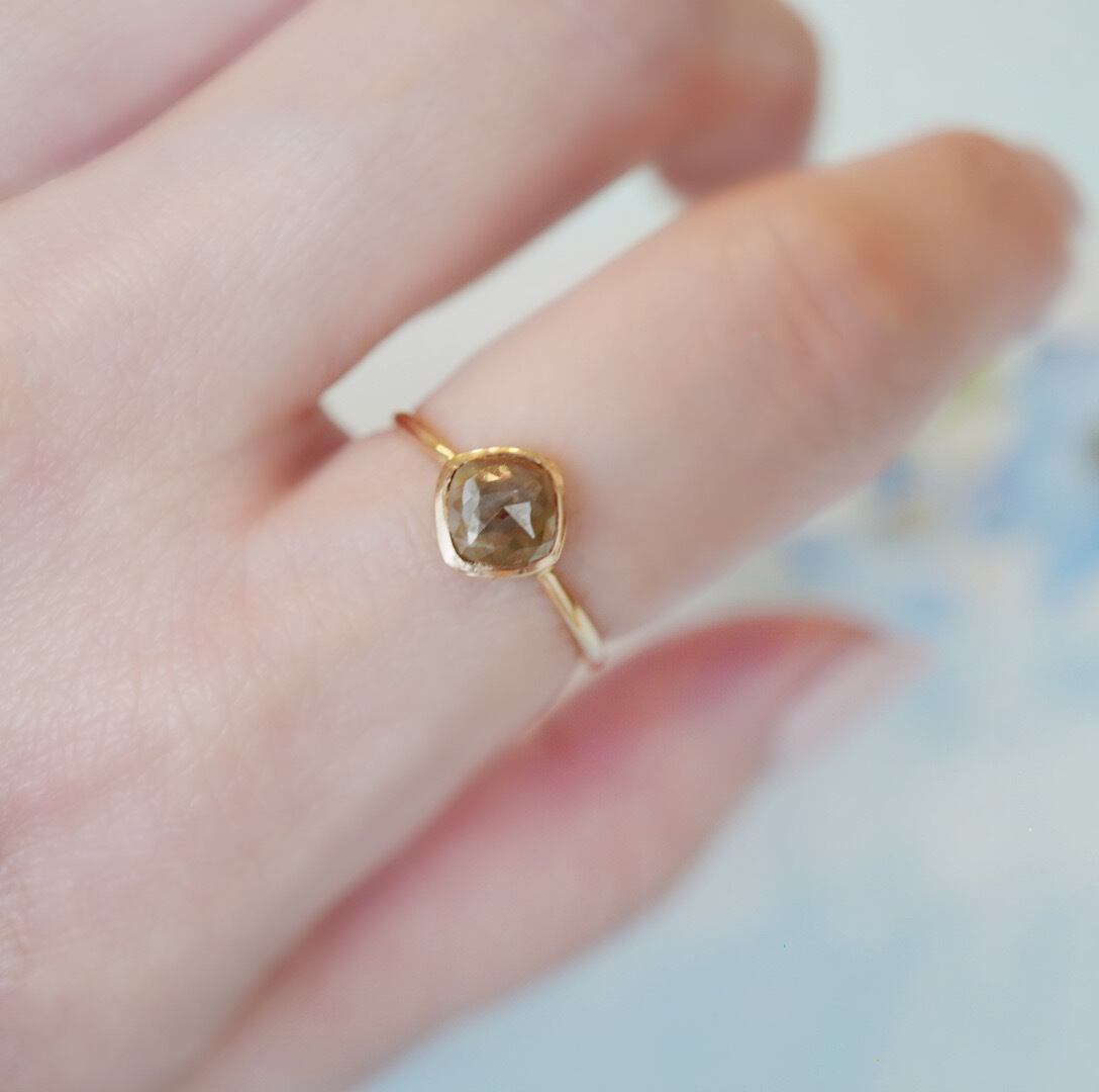 度重なる奇跡により、長い旅を経てようやく地表に現れた自然の姿のダイヤモンドを、その大地の色の美しさをそのまま活かして、宝石の都市インド、ジャイプールの職人がローズカットを施し10kの地金で上品なリングに仕上げました。