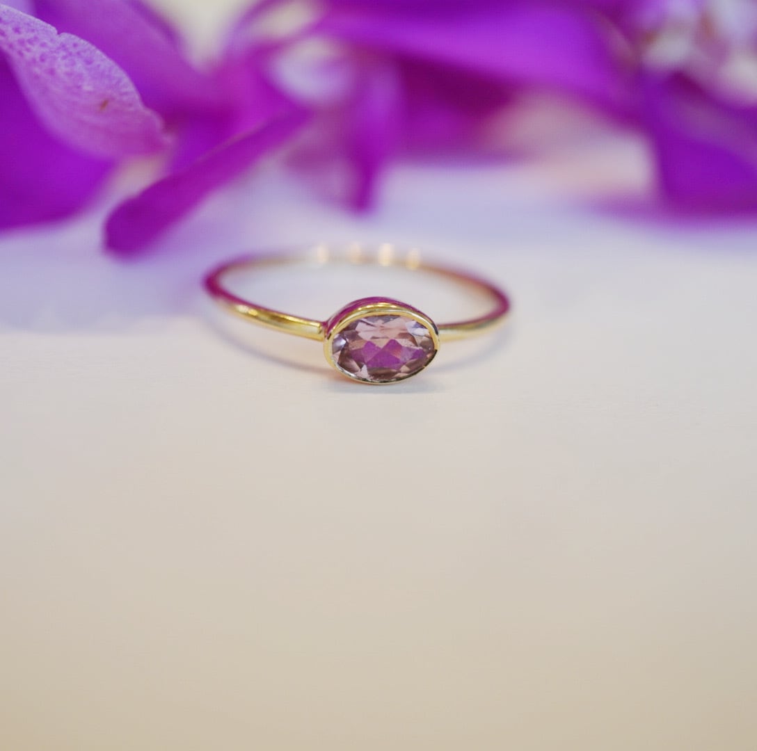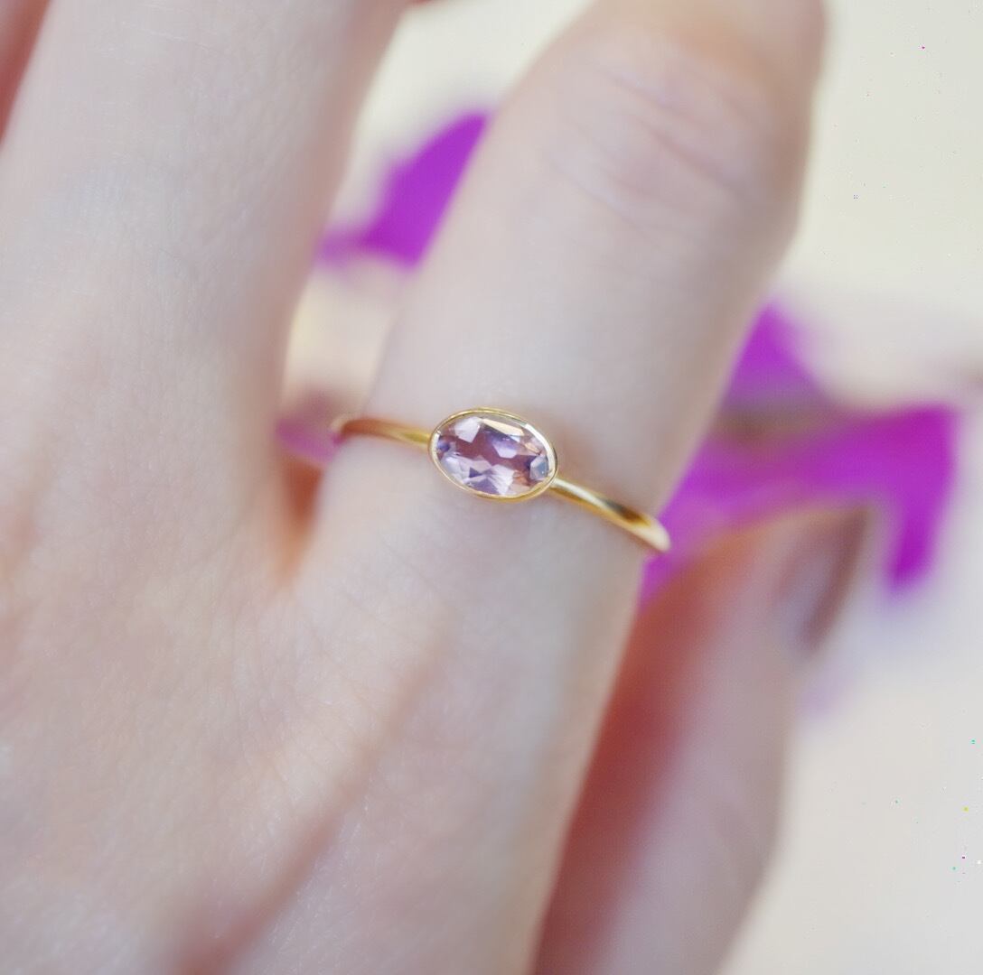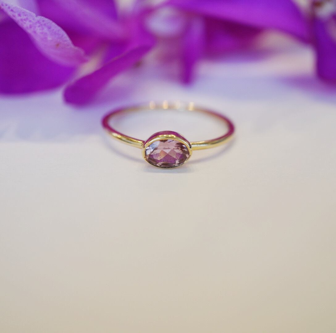 澄んだ透明感が際立つパープルピンクサファイアを宝石の都市インド、ジャイプールの職人が10kの地金で小さなオーバル型の美しいリングに仕立てました。