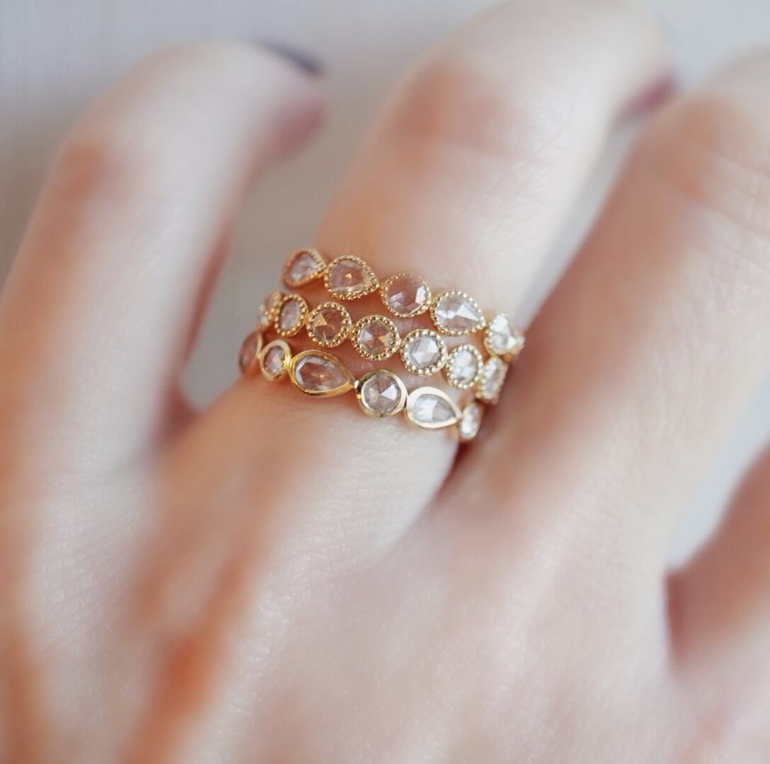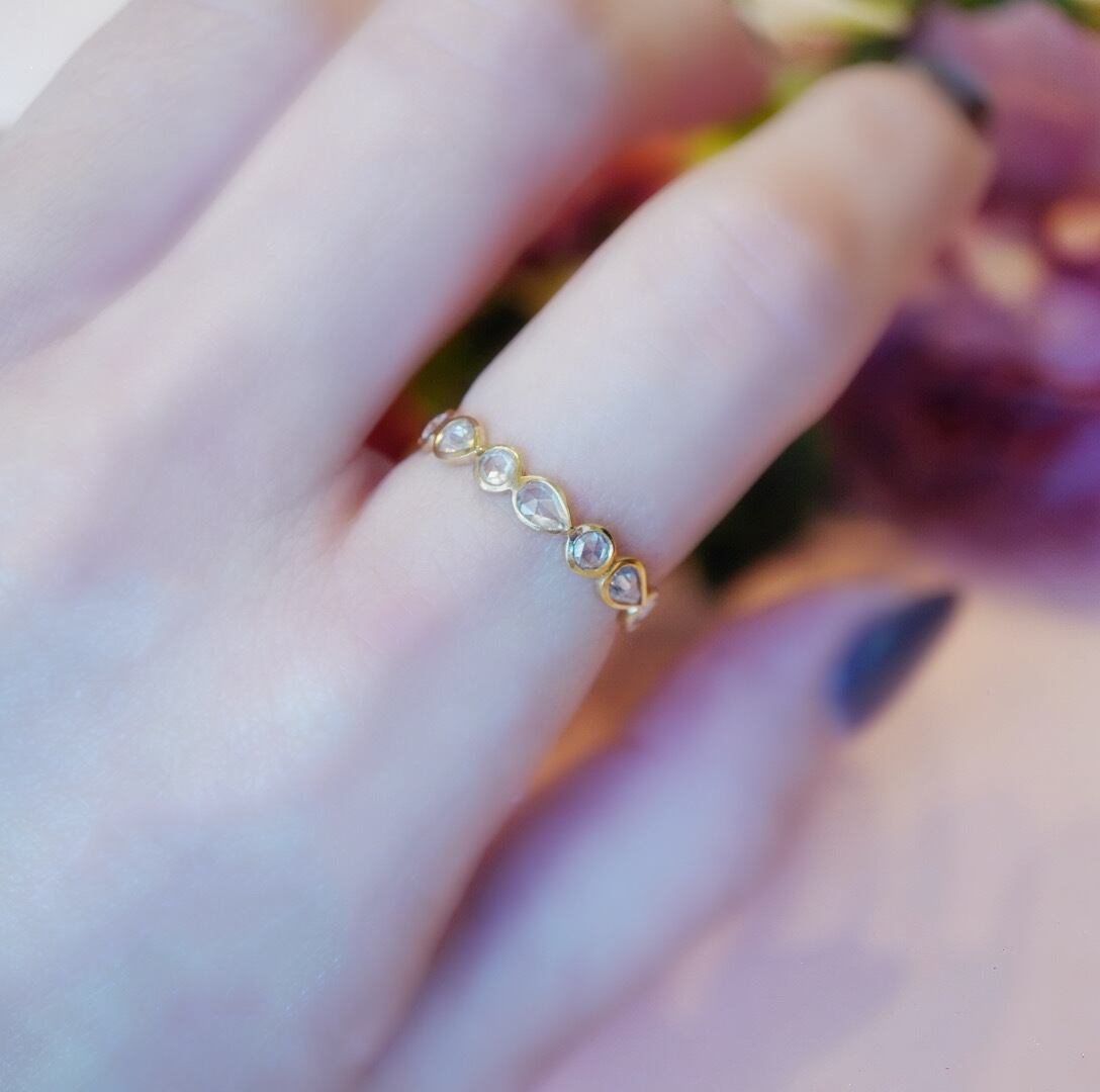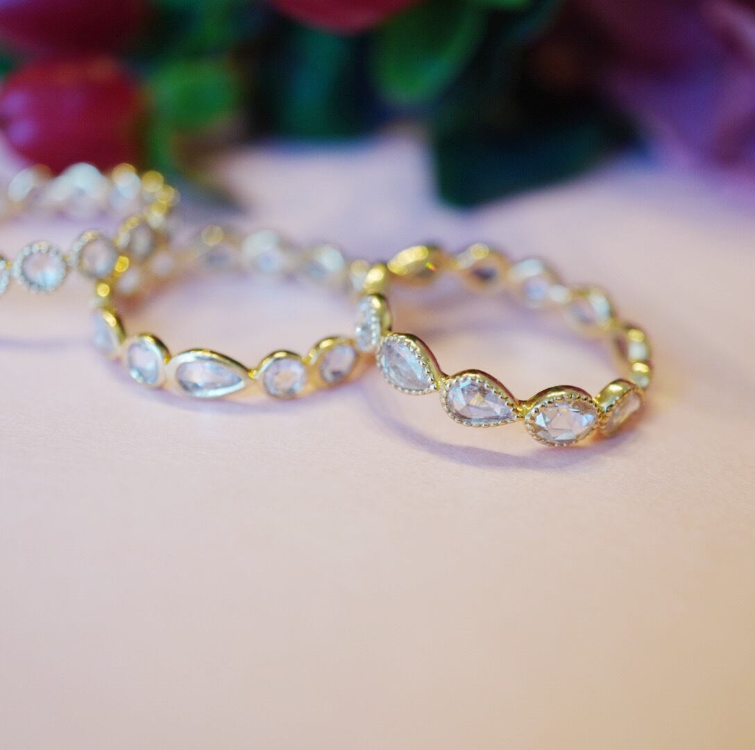 度重なる奇跡により、長い旅を経てようやく地表に現れたダイヤモンドを贅沢に使って、宝石の都市インド、ジャイプールの職人が一石一石にローズカットを施し、石そのもののフォルムを活かした繊細で美しいエタニティリングを作り上げました。