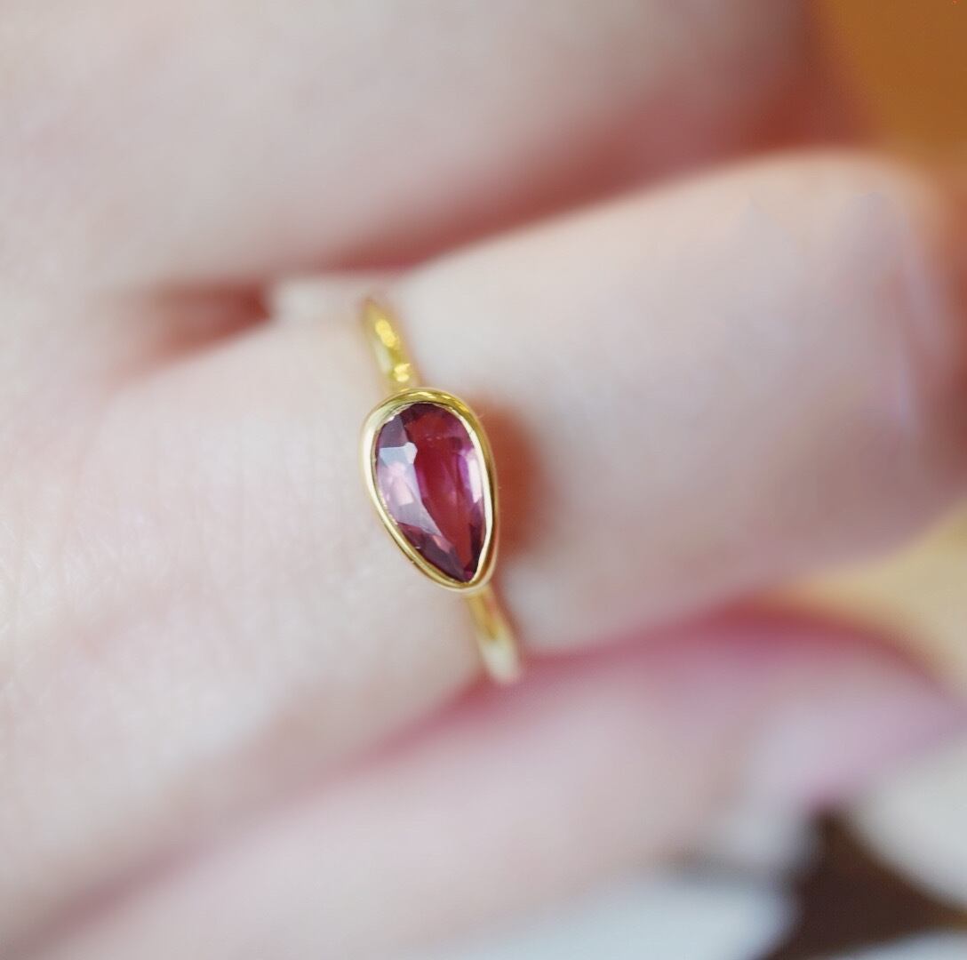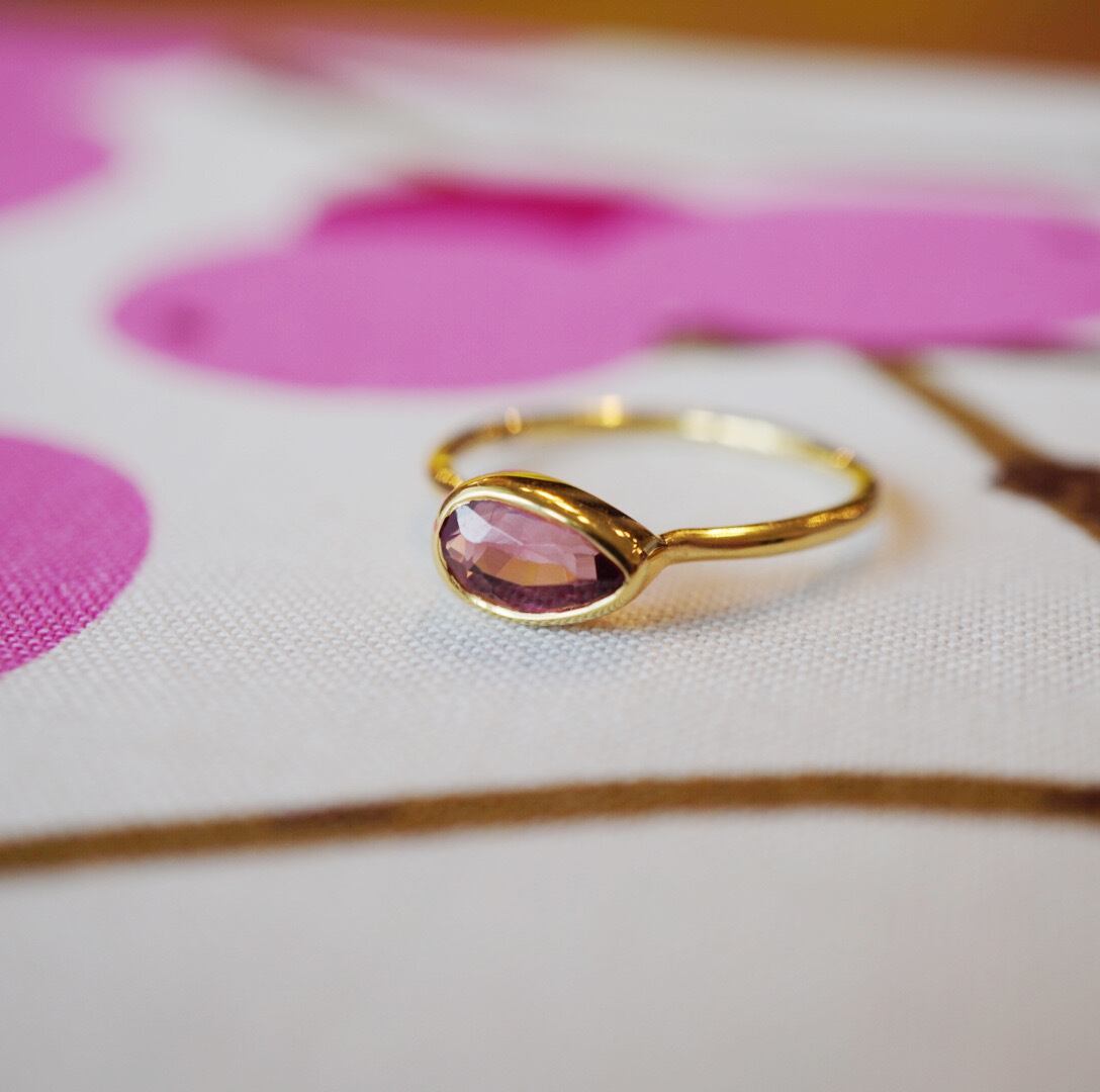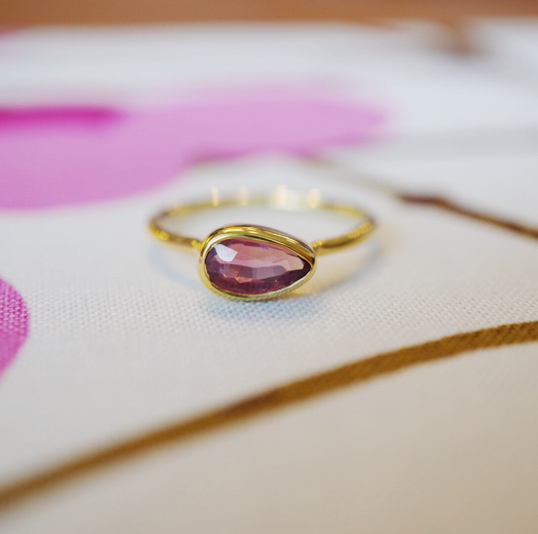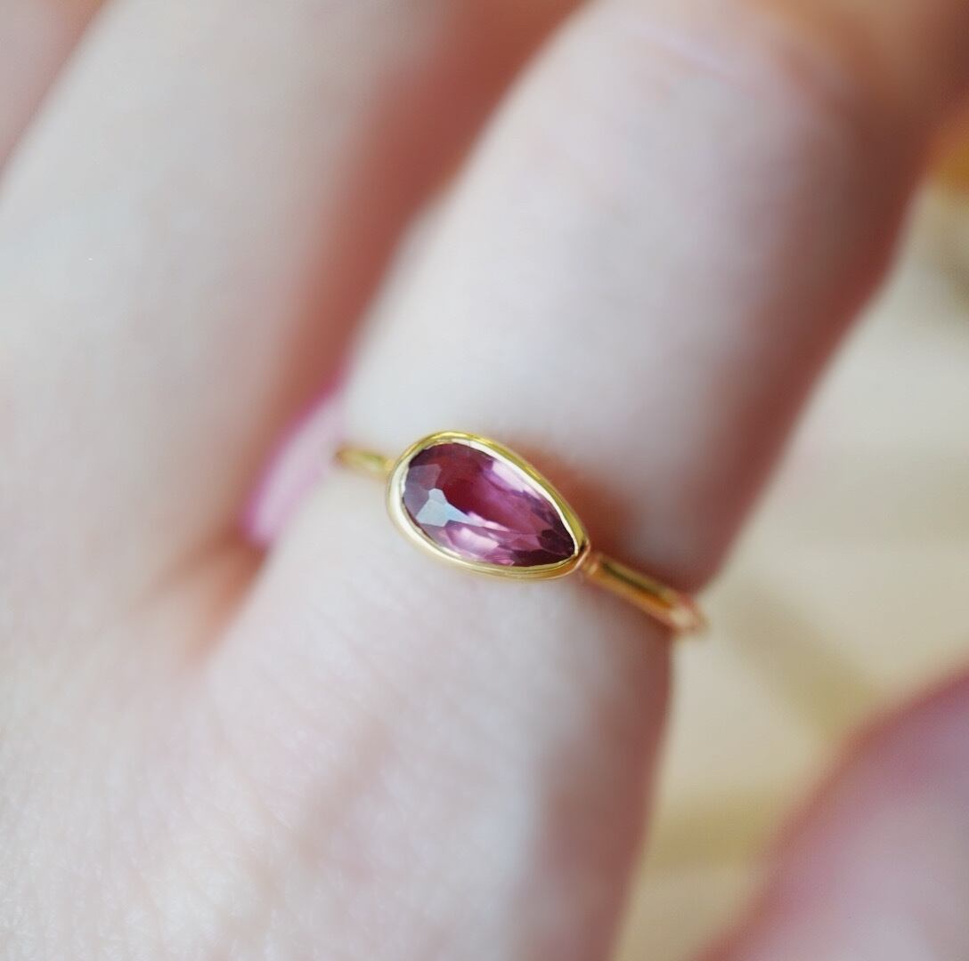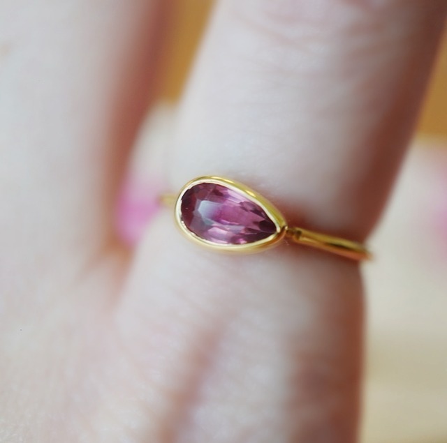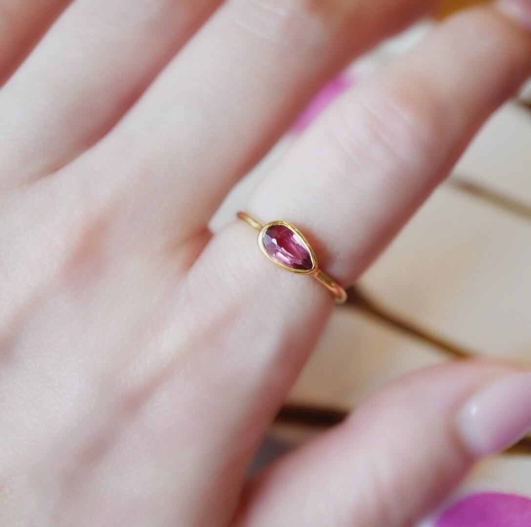 宝石の都インド、ジャイプールの職人が絶妙なピンクの色味を活かしてペアシェイプ型の美しいリングに仕立てました。