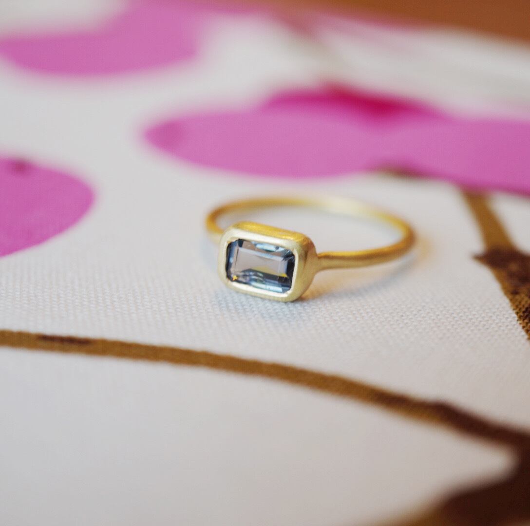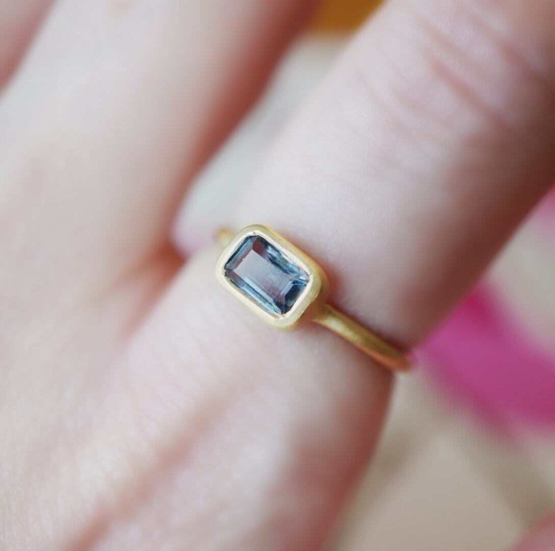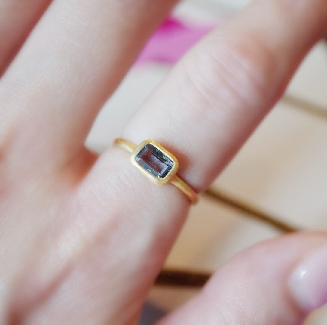 宝石の都インド、ジャイプールの職人が透き通ったブルーの色味を活かして艶消しのアームでスクエア型の美しいリングに仕立てました。