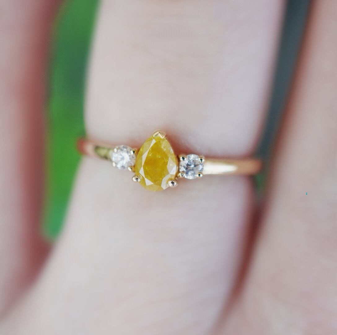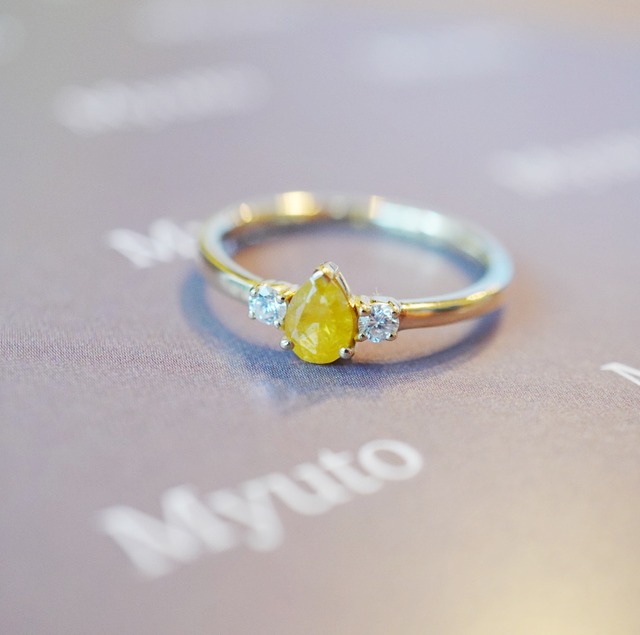 度重なる奇跡により、長い旅を経てようやく地表に現れた自然の姿のダイヤモンドを、その大地の色の美しさをそのまま活かして、宝石の都市インド、ジャイプールの職人が18kの地金で美しいイエローダイヤモンドのペアシェイプリングに仕立てました。