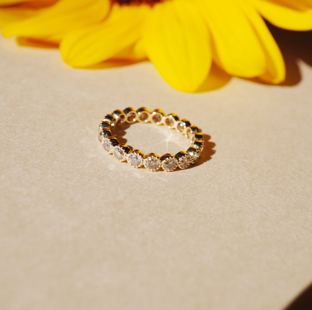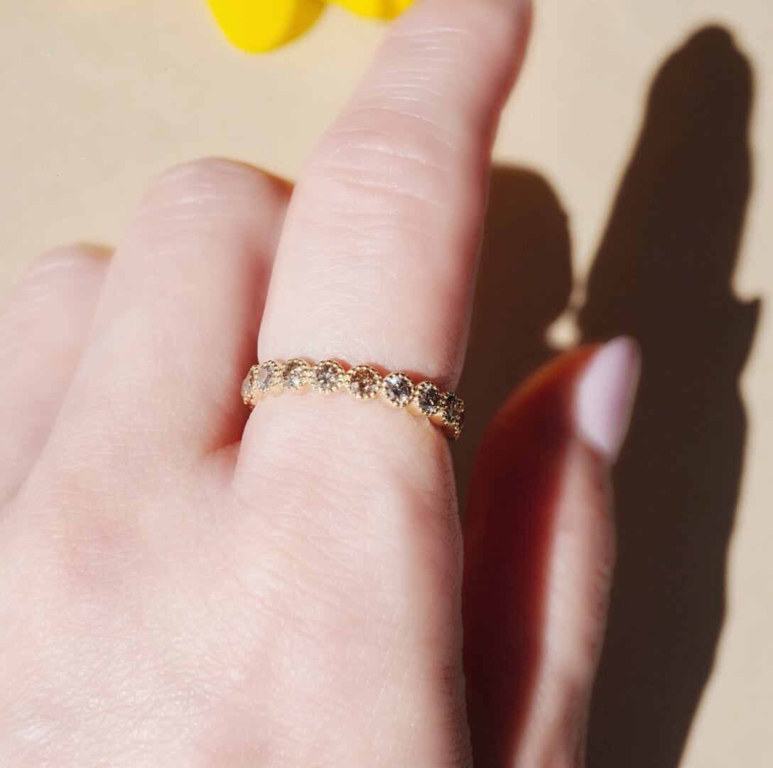度重なる奇跡により、長い旅を経てようやく地表に現れたダイヤモンドを贅沢に使って、宝石の都市インド、ジャイプールの職人が一石一石にローズカットを施し、ブラウンの色味を活かした美しいエタニティリングを作り上げました。