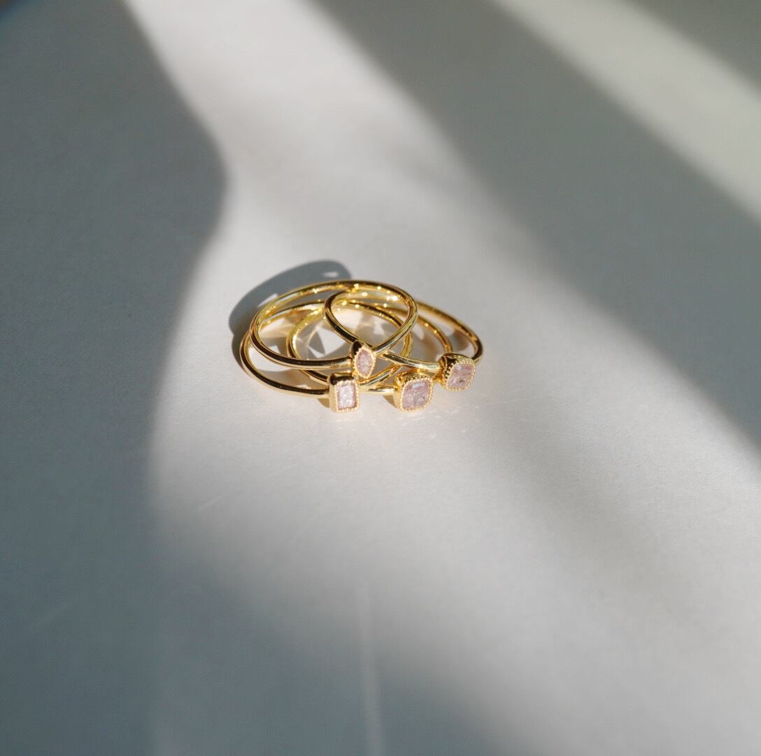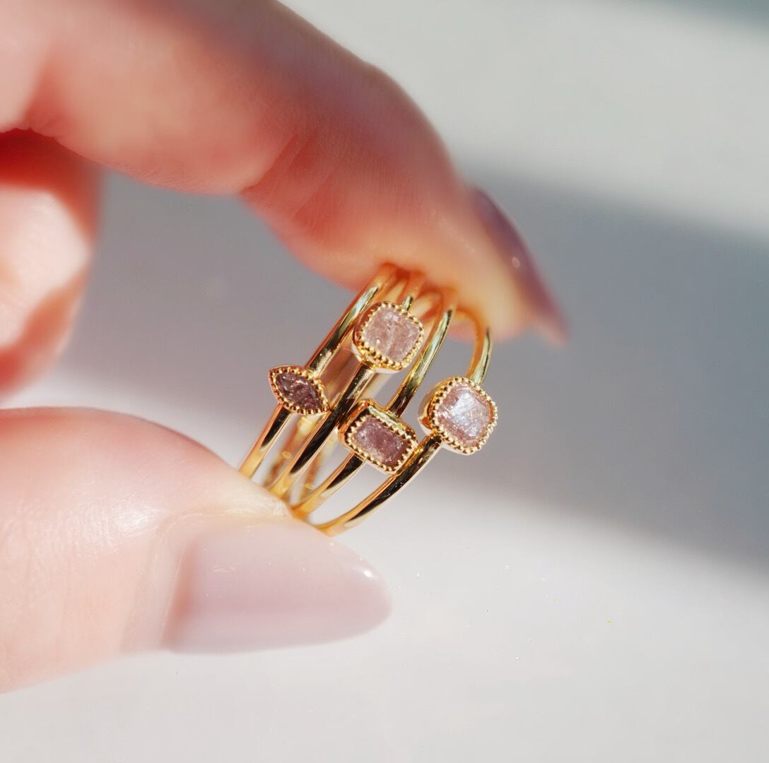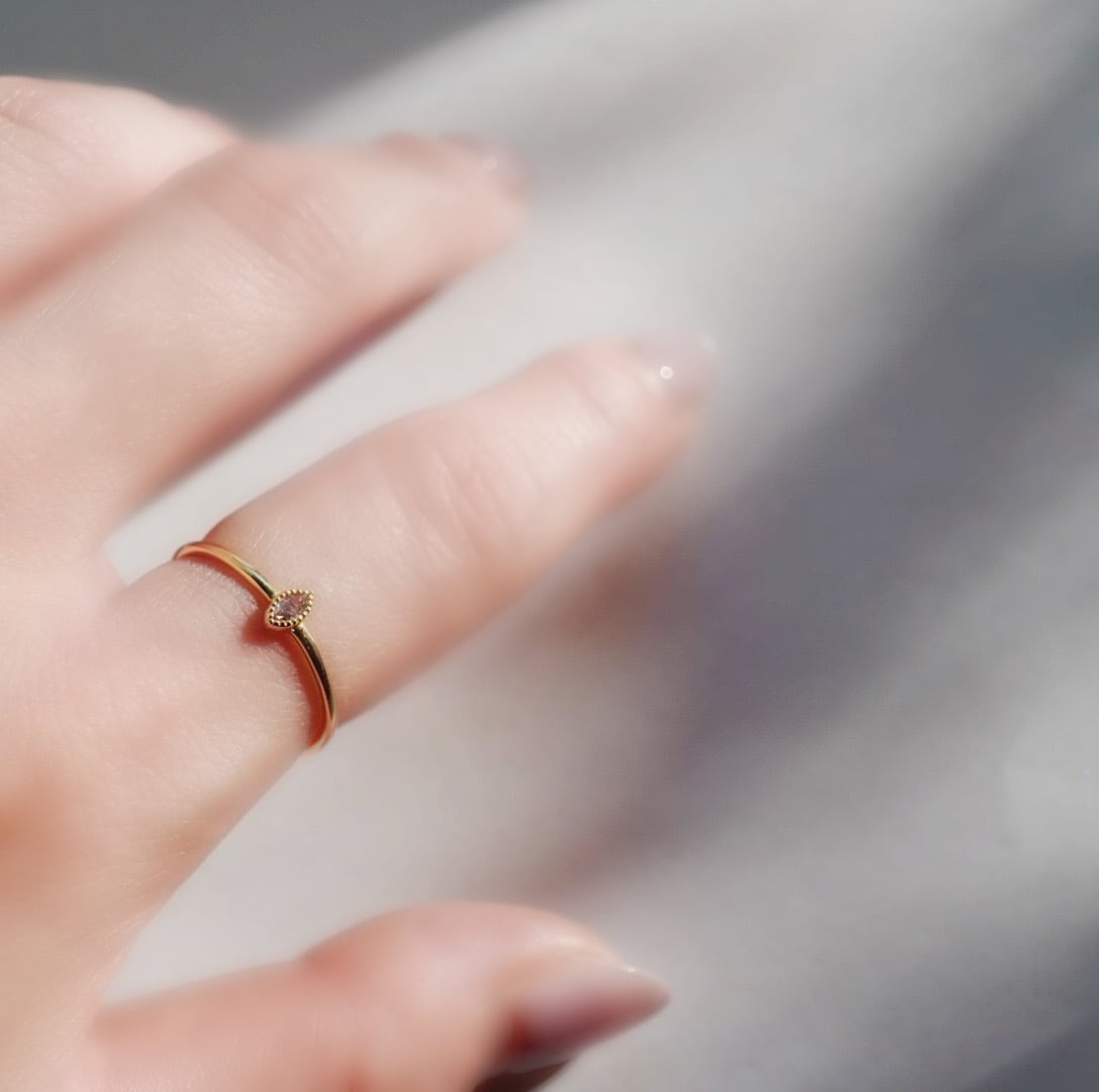 度重なる奇跡により、長い旅を経てようやく地表に現れた希少なピンク色のダイヤモンドを宝石の都市インド、ジャイプールの職人が18kのミル打ちを施した地金で包み、唯一無二の美しいマーキス型リングに仕立てました。