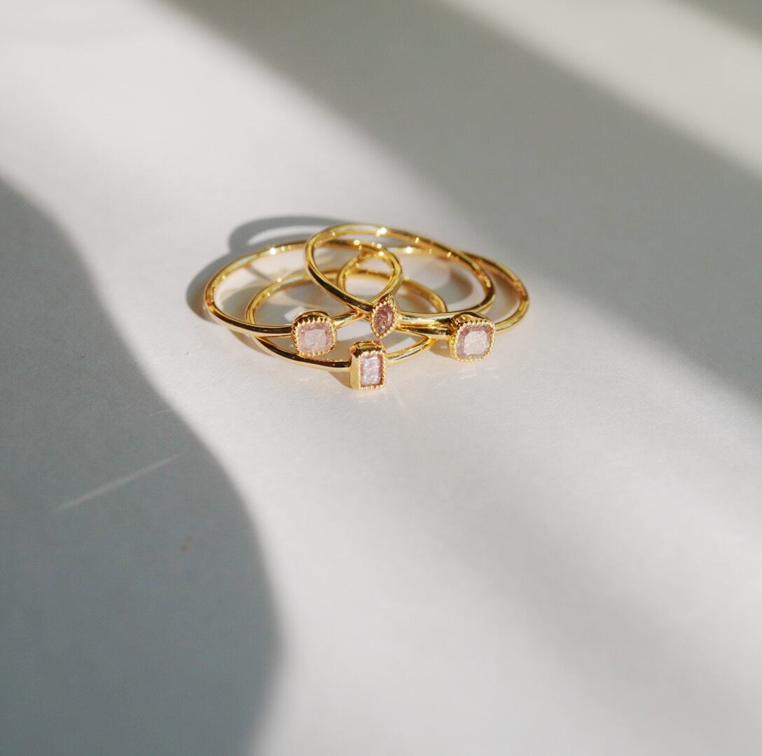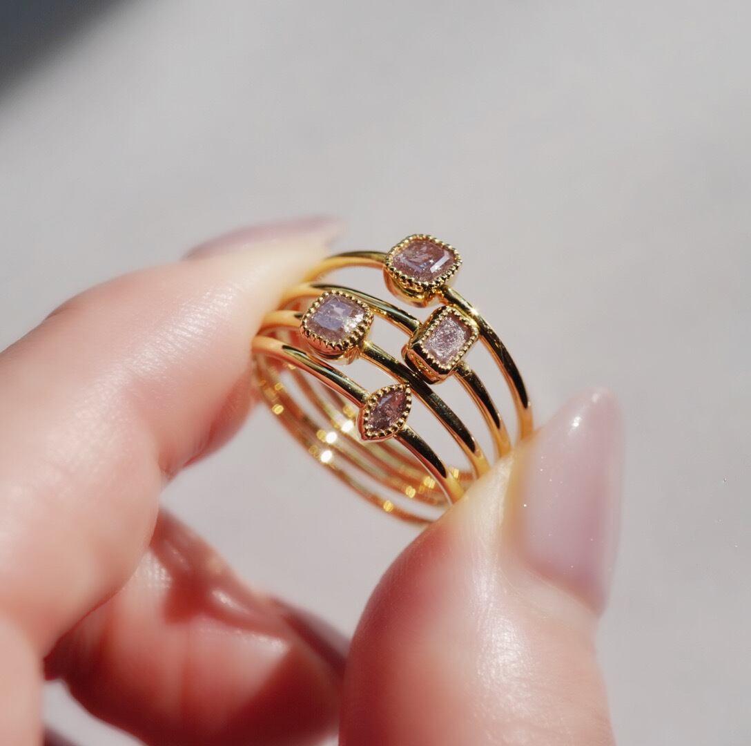 度重なる奇跡により、長い旅を経てようやく地表に現れた希少なピンク色のダイヤモンドを宝石の都市インド、ジャイプールの職人が18kのミル打ちを施した地金で包み、唯一無二の美しいスクエア型リングに仕立てました。